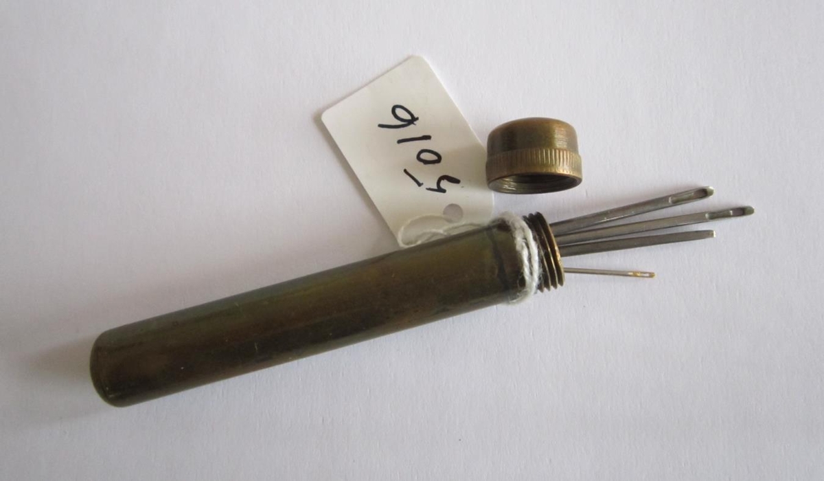 Nálhús úr kopar með skrúfuðu loki, í því eru 3 grófar og 2 fínar nálar.