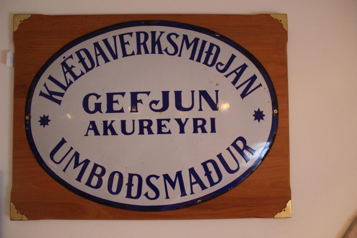 Skiltið er úr málmi á trégrunni með kopar á hornum.