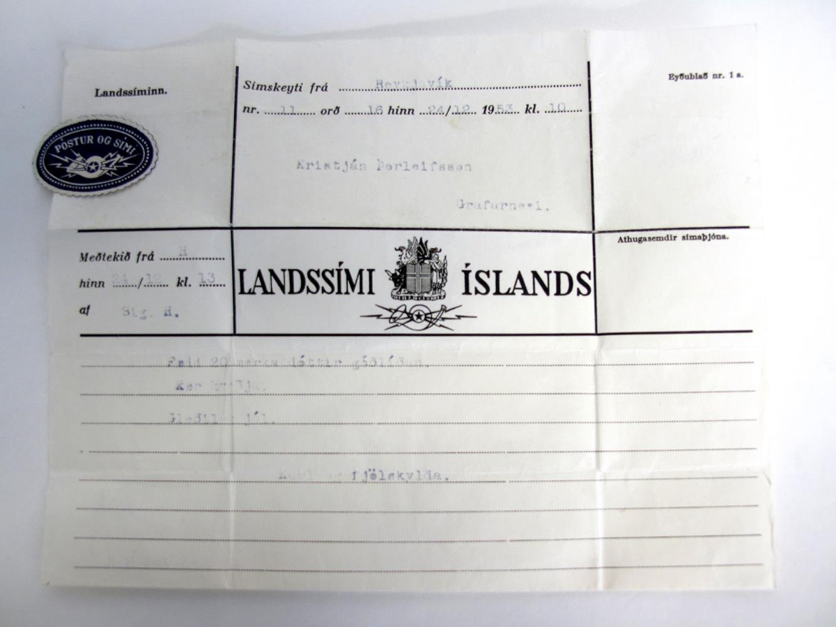 Símskeyti, sent í gegnum Landssíma Íslands. Skeytið sendi faðir gefanda, Karl Þorleifur Kristjánsson, til föður síns, Kristjáns Þorleifs Þorleifssonar í Grafarnesi (nú Grundarfirði) á aðfangadag árið 1953 til að tilkynna foreldrum sínum fæðingu Hafdísar (gefanda). Hún fæddist tveimur dögum fyrr.