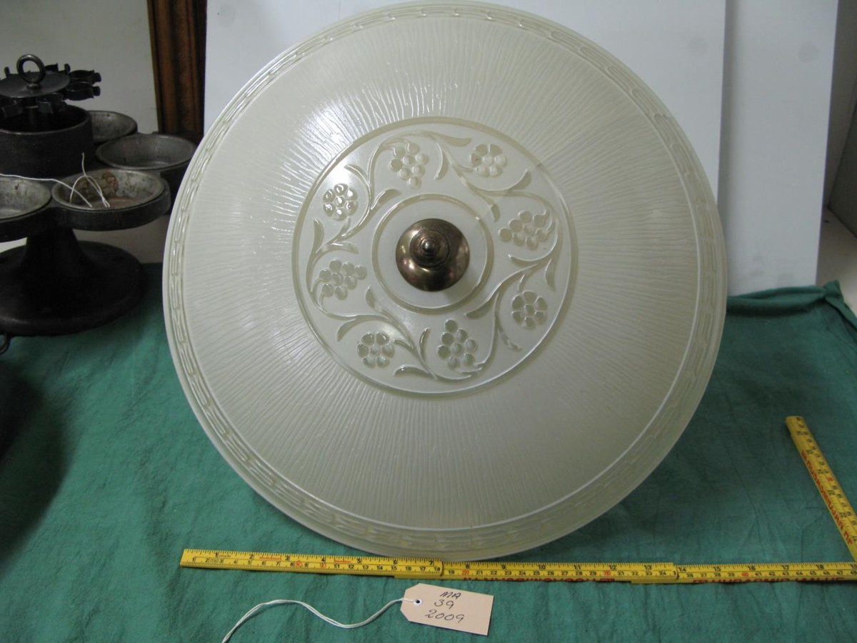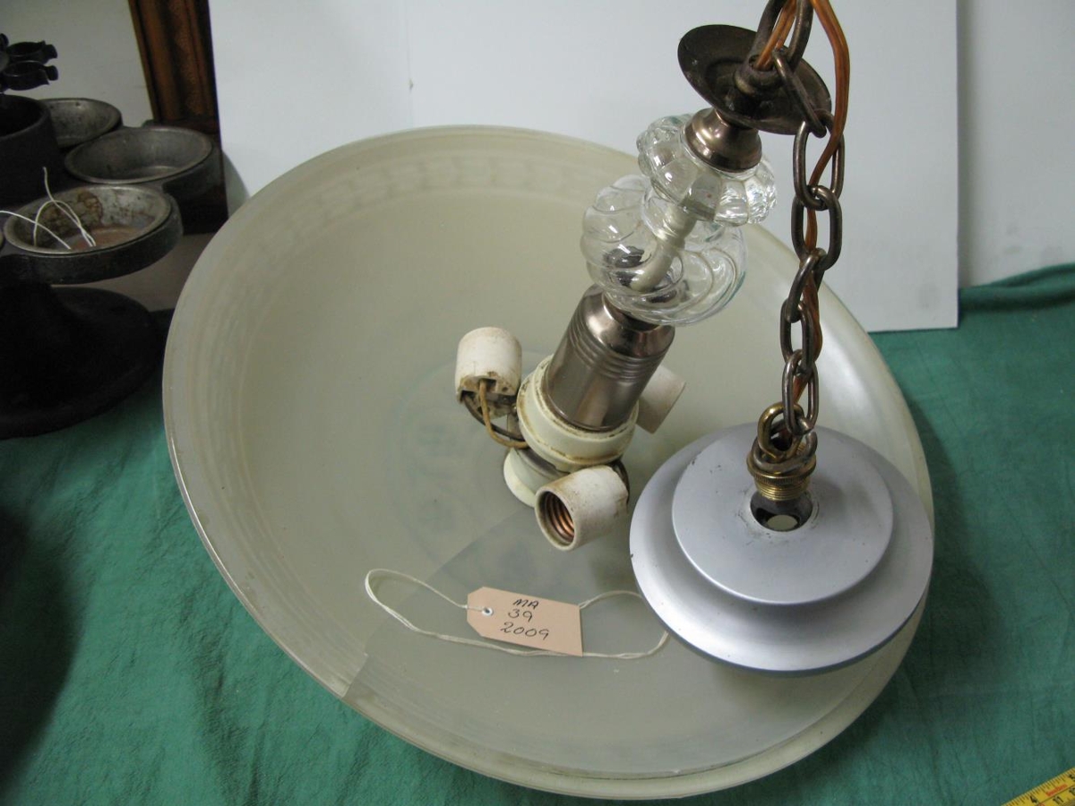 Stórt loftljós með stórum kúptum glerkúp, kúptum disk (ath. kúpullinn er sprunginn öðru megin frá miðju). Kúpullinn er rifflaður með bekk á jaðrinum, en rósamynstri í miðju. Messing kúla gengur niður úr kúplinum og tengir ljósið saman. Þrjú perustæði eru í ljósinu, en málmlituð stöng upp úr og á enda hennar en glerpípa, gler með rifflum. Upp úr glerpípunni gengur málmur sem endar í auga og keðju upp í loft. Málm hringur efst til að loka dósinni. Ljósið er úr gamla Læknabústaðnum, Lagarási 22, sem var byggður um svipað leiti og sjúkrahúsið.