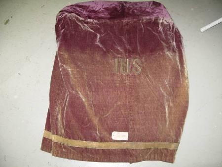 Úr fjólubláu flaueli. Upplitað. "IHS" saumað í það. Úr Mjóafjarðarkirkju.