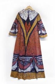 Síður kjóll með batikmynstri, í hvítum, bláum, rauðum og gulum litum. Hann er með einskonar kyrtilsniði og fóður er ljósfjólublátt. Hann er smelltur að framan frá hálsmáli með þremur litlum smellum. Að að framanverðu er kjóllinn orðinn eilítið upplitaður, frá brjósti og uppúr. Gefandi, Bryndís Schram, segir í meðfylgjandi bréfi: