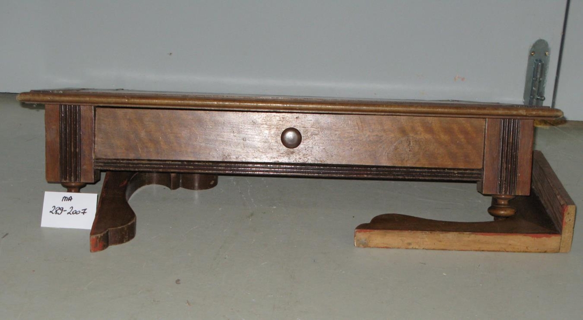 Skrifpúlt sem ætlað er að hanga á vegg. Tveir okar sem halda því uppi og eru lausir frá því. Skúffa er undir plötunni. Renndir hnúðar ganga niður úr kjálkum sem eru undir plötunni. Platan sjálf er spónlögð.