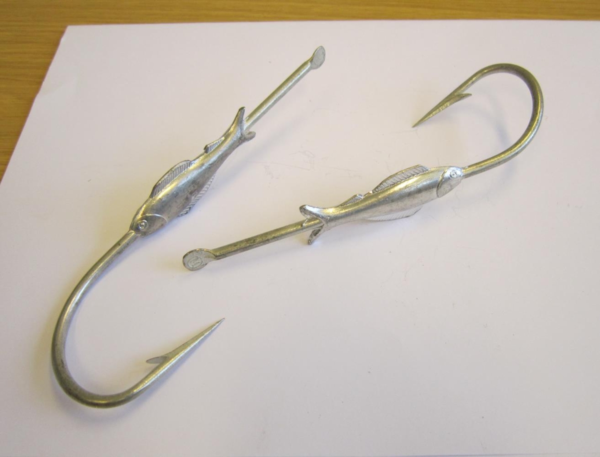2 önglar, stórir u.þ.b. 15 cm langir úr ljósri málmblöndu.