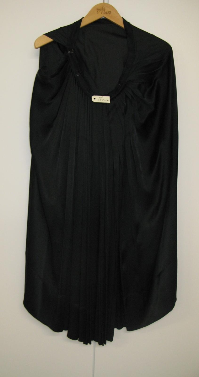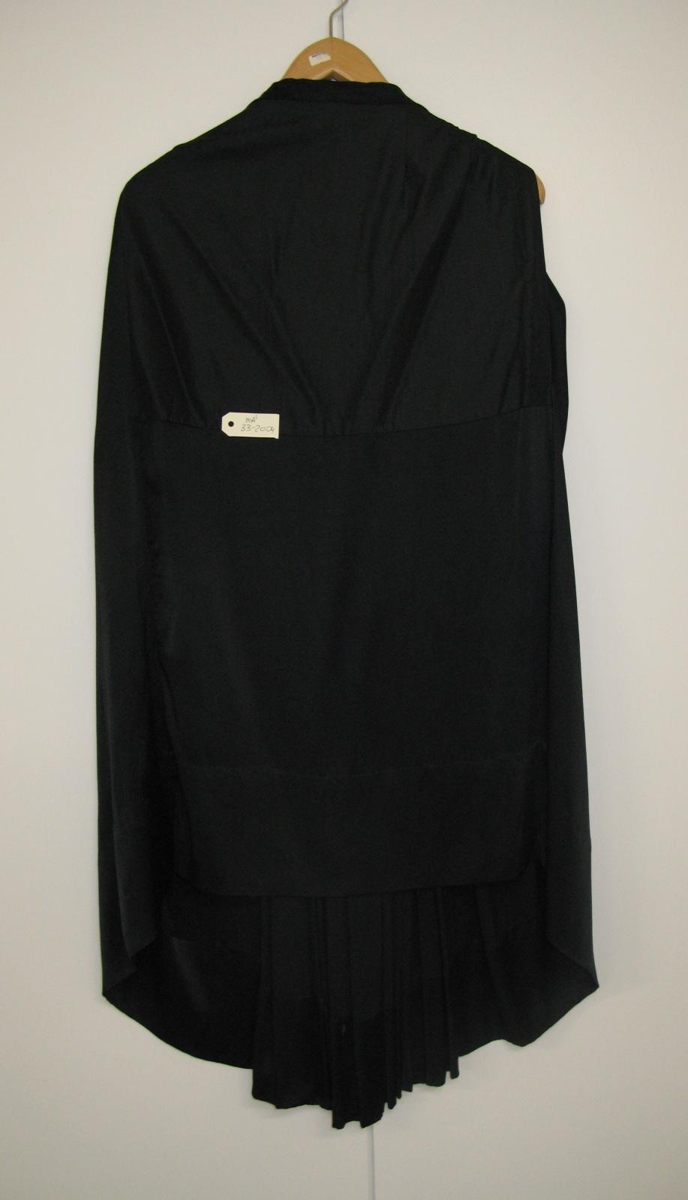 Svart peysufatapils úr satíni, slitið af notkun. Var í eigu Ingibjargar Stefánsdóttur, ljósmóður.
