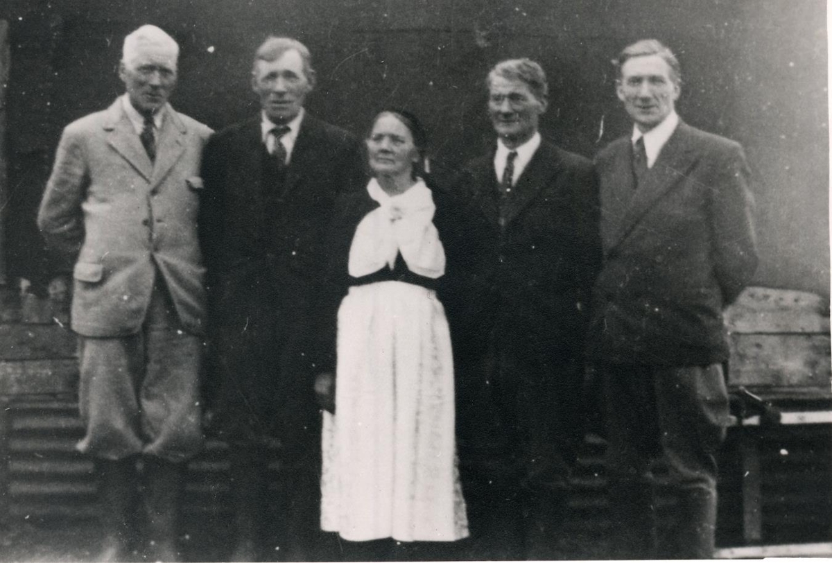 A myndinni eru þeir bræður Guðmundur og Helgi frá Hlíðarenda að heimsækja systur sína Bóel að Borgareyrum. Þeir eru til vinstri á myndinni ásamt systur sinni í peysufötum og tveimur ónafngreindum mönnum.