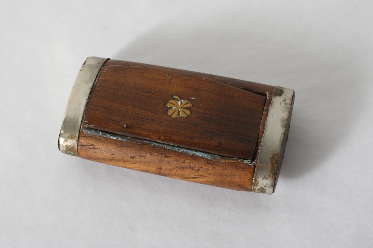Brún. Nýsilfursklæðning á endum. Gylltur fjögurra laufa smári felldur ofan í lokið. Úr eigu Stefáns Jónssonar, Ekru (f.1893, d.1968).
