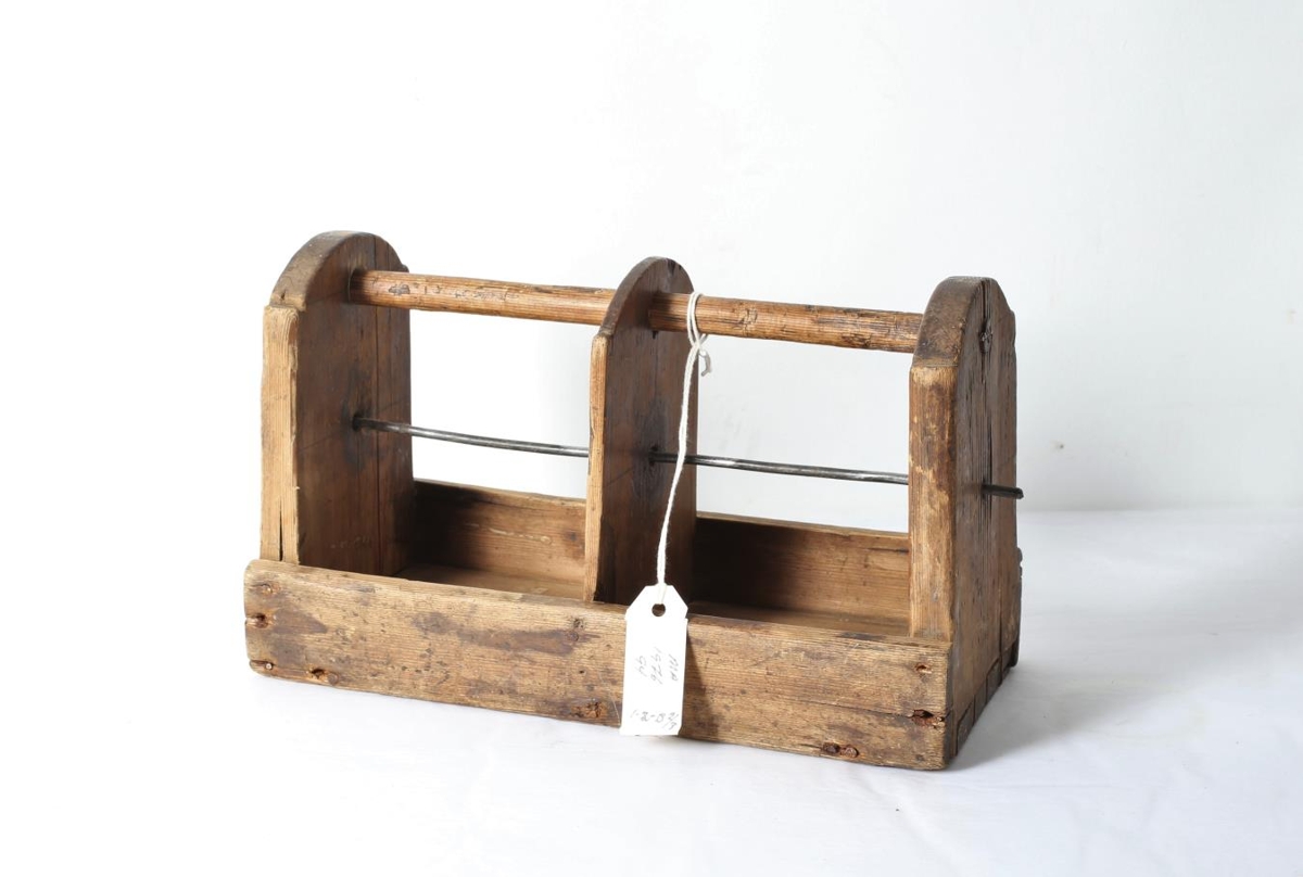 Tvöfaldur snældustóll með skilrúmi á milli hólfa og einn tein í gegnum fyrir tvær snældur. Úr eigu Gróu Jónsdóttur frá Litla-Steinsvaði.