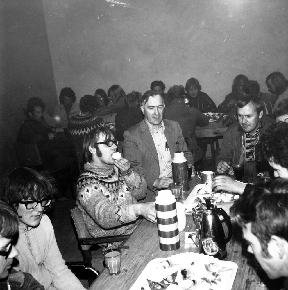 Maggi Gísla að hám í sig snittu