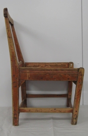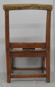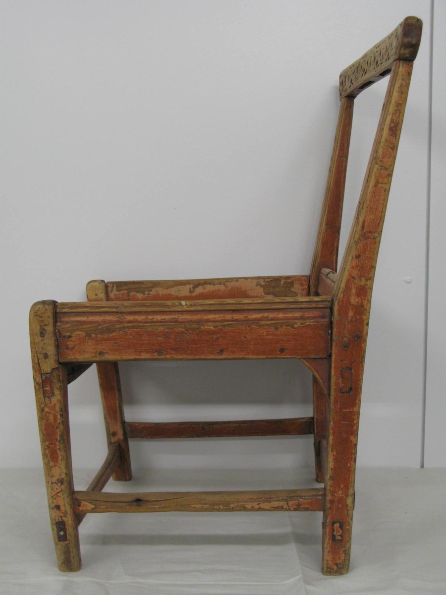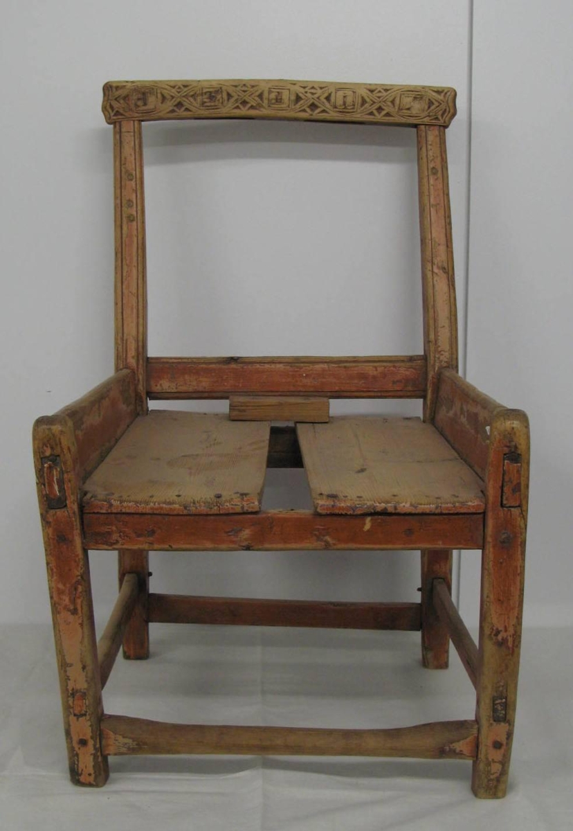 Stóll sem er rauður og frekar breiður með tveimur fjölum í setu. Efsta fjölin í baki er útskorin með höfðaletri og gæti verði "Guðný". Fjalir í bakinu vantar.