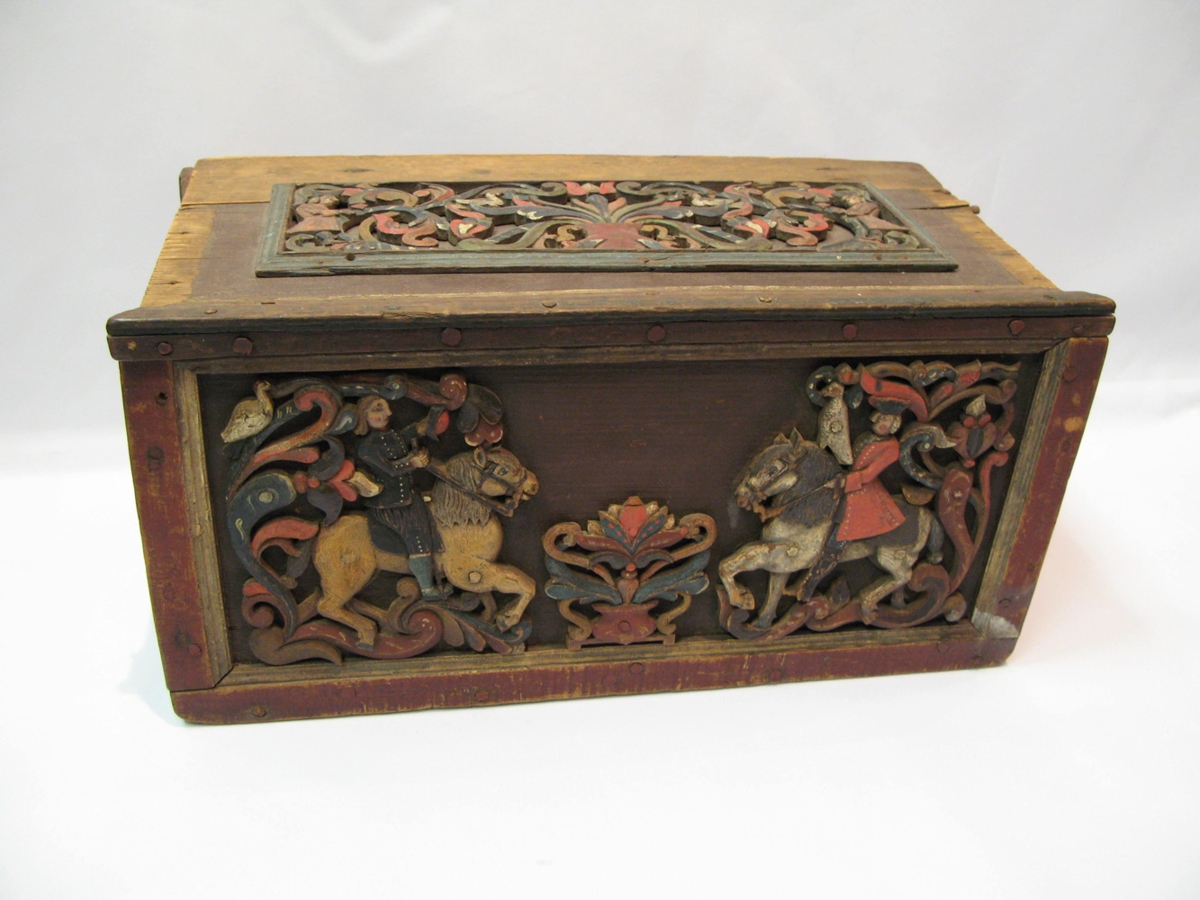 Af grunnsýningu 1996: Kistillinn er frá Sigurði Jónssyni (1886-1962), Ósi í Breiðdalshreppi. Sú sögn fylgdi gripnum að hann hafi upprunalega komið frá Gunnlaugi sýslumanni Bríem (1773-1834) en Haraldur bróðir hans bjó að Eyjum í Breiðdalsvík. Kistillinn er útskorinn í rókókóstíl, negldur með trénöglum, en þessi atriði benda til þess að gripurinn sé 17. eða 18. aldar smíð. Skrautið á kistlinum er líklega byggt upp eftir einhverri sögn en það myndar menn ríðandi á hestum með hauka á öxlunum en haukar eru þekkt hefðartákn. Gaman væri ef einhver þekkti söguna sem liggur að baki skrautverksins. Samskonar kistill er til á Þjóðminjasafni Íslands en skraut hans myndar söguna um biðilinn sem ríður í hlað, með hauk á öxlinni, og er tekið fagnandi af bóndanum, vinnumanni og prúðbúinni heimasætunni. Þetta myndefni er algengt víða um heim en hér hefur listamaðurinn klætt fólkið í íslenskan búning. En hver var svo þessi listamaður? Talið er að Hallgrímur Jónsson frá Naustum í Eyjafirði hafi smíðað kistilinn sem til er á Þjóðminjasafninu. Líklega er þessi kistill hér einnig smíðaður af Hallgrími eða syni hans Jóni. Norski fræðimaðurinn Ellen Marie Mageöy, sem hlaut doktorsnafnsbót fyrir skrif sín um jurtaskreyti í íslenskum tréskurði árið 1969, dregur þó í efa að kistillinn sé eftir Hallgrím heldur óþekktan 18. aldar skurðmeistara, sem hljóti að hafa numið erlendis. Þetta hefur ekki verið kannað til hlítar, en í raun er fátt sem mælir mót því að gripirnir séu eftir Hallgrím. Hallgrímur fæddist árið 1717 og lést 1758. Jón, sonur Hallgríms, sigldi utan og nam handverk en þeir feðgar voru helstu skreytingarmenn kirkna á Norðurlandi á 18. öld. Eftir þá liggja, að því að talið er, fjölmargar altaristöflur, predikunarstólar og margvíslegir útskornir gripir. Gunnlaugur Bríem og Hallgrímur Jónsson voru sveitungar, bjuggu báðir í Eyjafirði, en samt sem áður ekki á sama tíma. Líklegt má þó telja að Gunnlaugur hafi fengið kistilinn frá Hallgrími eða syni hans Jóni. MA 157/1948. Heimild: Þóra Kristjánsdóttir 1994: Kistill úr eigu Sigurðar málar. Gersemar og þarfaþing. Bls. 30-31. Hið íslenska bókmenntafélag.