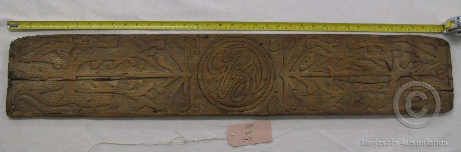 Útskorinn hringur í miðju með stöfunum "G.B.D." Laufaskurður til endanna og ártalið 1850 skorið kringum hringinn. Í safnherberginu á Skriðuklaustri var festur miði við fjölina þar sem á stóð: "Frá Þorvaldsstöðum í Skriðdal." Við skrásetningu muna frá Skriðuklaustri sumarið 1977 kom í ljós annar miði sem fylgt hefir rúmfjölinni. Þar sagði að gefendur væru Friðrik Jónsson á Þorvaldsstöðum og kona hans.