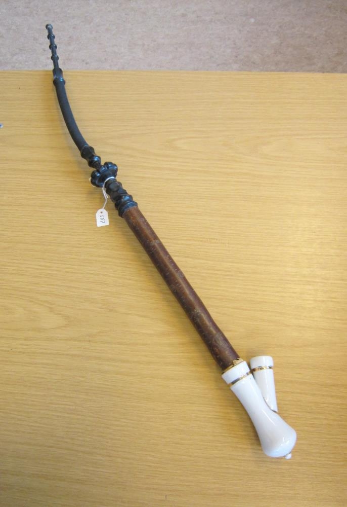 Pípa frá Páli Blöndal, lækni í Stafholtsey í Andakílshreppi. Pípan er um 68 cm þegar munnstykki er skrúfað á hana. Pípuhausinn er úr postulíni með gyllingu, þar fyrir ofan tekur við 21 cm löng holuð innan trjágrein. Munnstykki og skrúfgangar útskorið úr dökkmáluðum viði með 13 cm tauvöfðum, sveiganlegum hólk á milli.