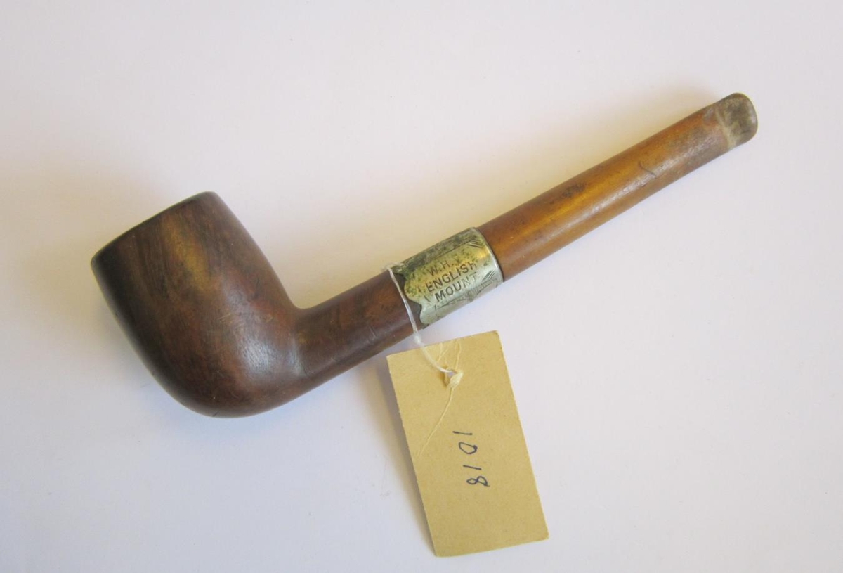 Reykjarpípa 13,5 cm löng. Milli hauss og munnstykkis er skreyttur silfurhólkur sem í er grafið, W.H. ENGLISH MOUNT.