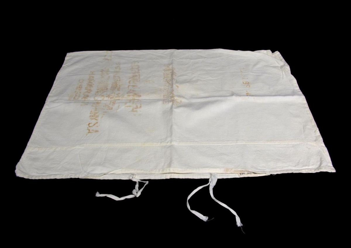 Koddaver, saumað úr sykurpoka, eins og algengt var á skömmtunarárunum um og uppúr miðbiki tuttugustu aldar. Sykur- og hveitipokar voru vinsælir á þessum árum og voru notaðir í rúmfatnað og ýmsan annan fatnað. Oft mynduðust raðir við bakhurðir bakaría þar sem húsmæður biðu eftir pokum. Þá þótti gott að þekkja einhvern sem vann í bakaríi og gat orðið manni úti um poka. Stafirnir, sem prentaðir voru á pokann, sjást enn á koddaverinu, en oftast voru áletranirnar þvegnar og hreinsaðar af pokunum áður en saumað var úr efninu. Áletrunin er orðin mjög máð og virðist annað hvort hafa smitast eða verið illa stimpluð á frá upphafi. Með samanburði við myndir á veraldarvefnum af slíkum pokum má þó sjá að þessi poki hefur verið merktur: