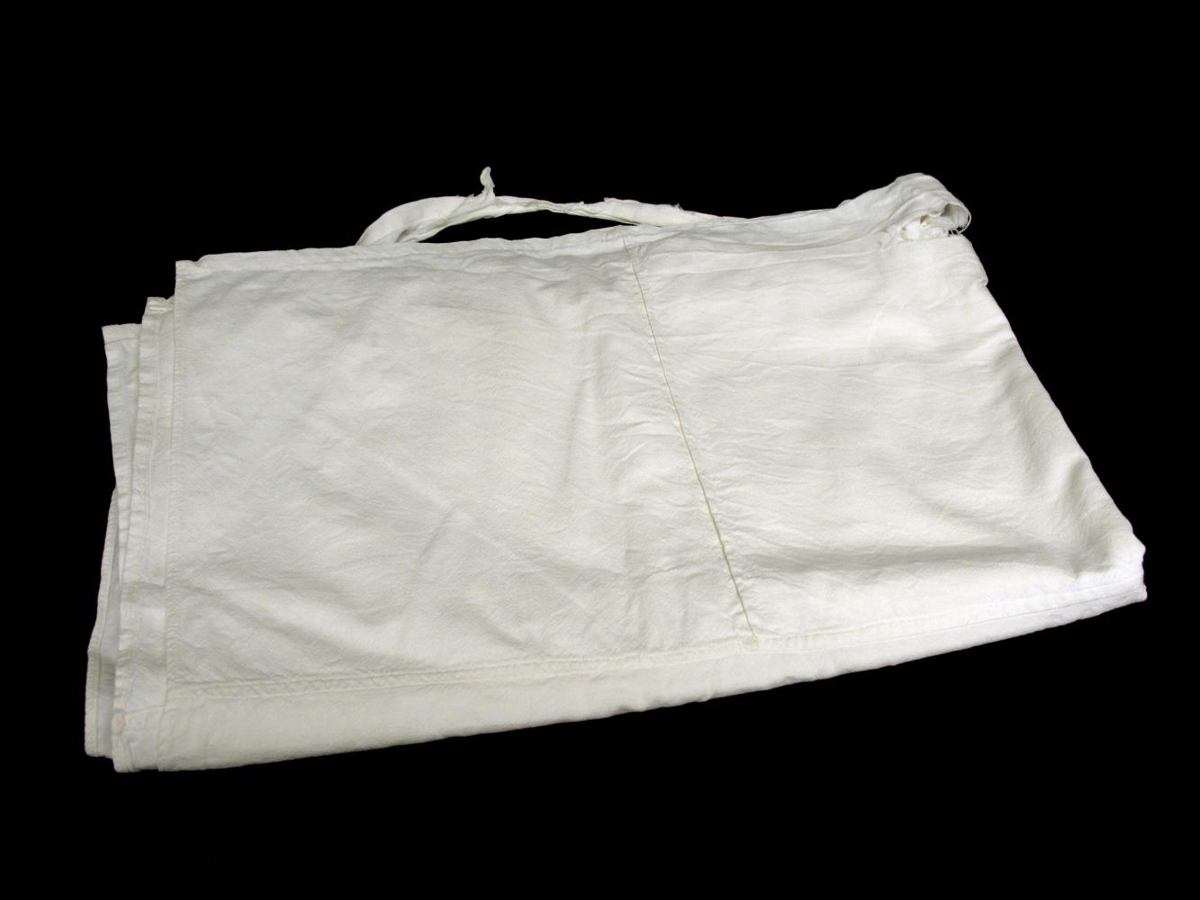 Hvítt lak, saumað úr hveitipokum eða sykurpokum á skömmtunarárunum um og uppúr miðbiki tuttugustu aldar. Sykur- og hveitipokar voru vinsælir á þessum árum og voru notaðir í rúmfatnað og ýmsan annan fatnað. Oft mynduðust raðir við bakhurðir bakaría þar sem húsmæður biðu eftir pokum. Þá þótti gott að þekkja einhvern sem vann í bakaríi og gat orðið manni úti um poka. Lakið er saumað úr átta misstórum efnisbútum. Stafirnir / áletranirnar af pokunum hafa verið þvegnar burt, eins og algengast var áður en saumað var upp úr pokunum. Lakið er í þokkalegu ástandi en hefur rifnað á fjórum stöðum, helst meðfram brúnum, væntanlega þar sem það hefur verið brotið undir rúmdýnu.