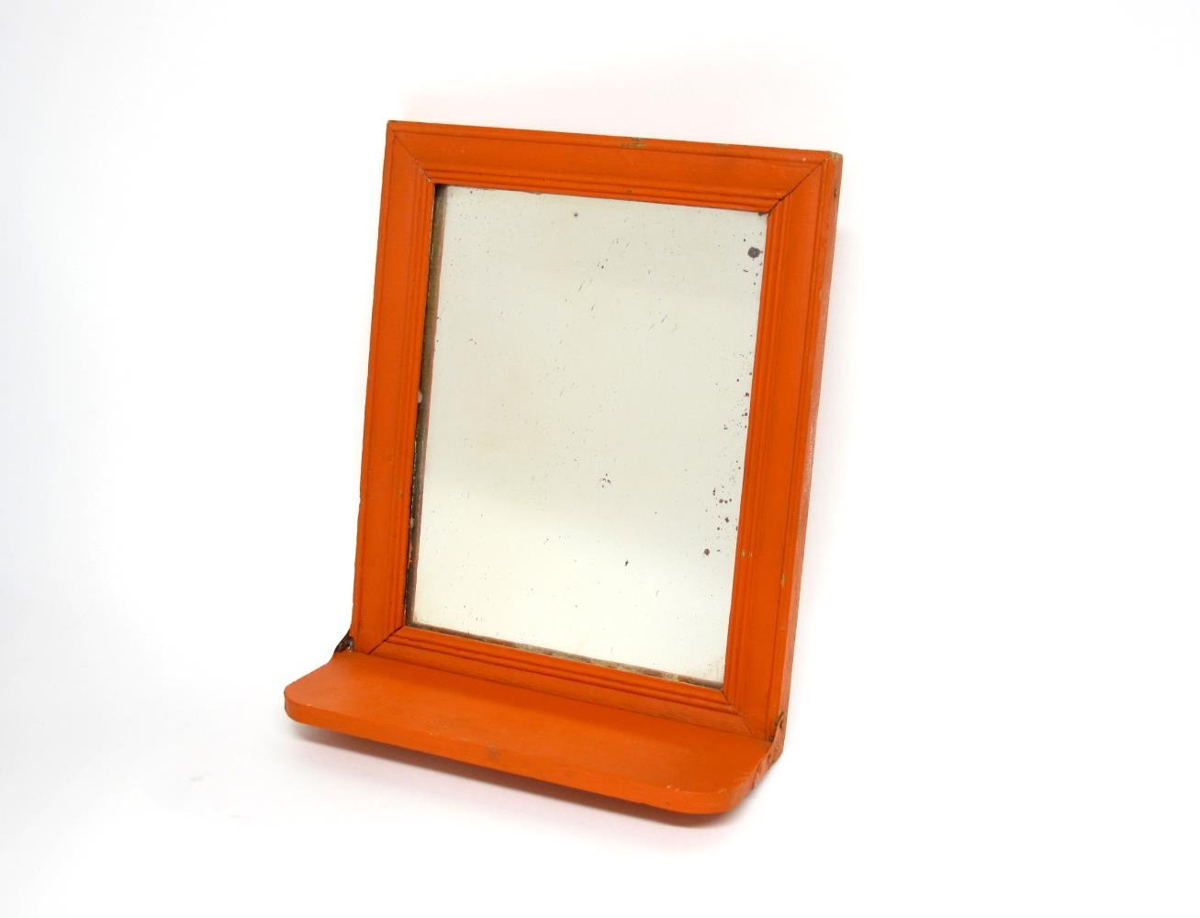 Lítill veggspegill í rauðmálaðri tréumgerð og með hillu við neðri brún sem hægt er að leggja að speglinum. Spegillinn var í húsinu að Laufásvegi 6 í Reykjavík. Hann er í góðu ástandi en eilitlar elliskellur eru í honum.