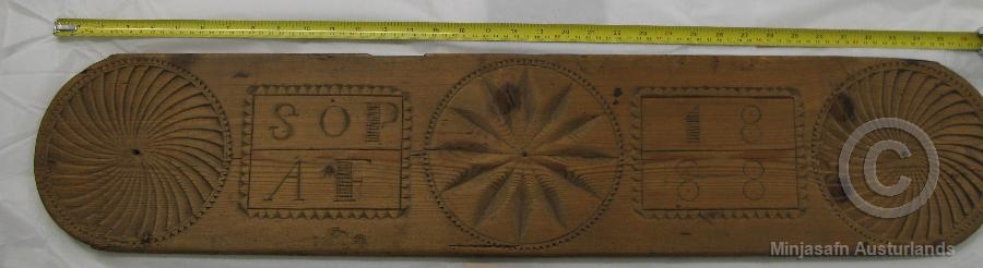 Í miðju og á endum eru skornar hringmyndaðar rósir. Jafnframt er skorið í fjölina: "S.Ó.P.Á.F. 1888". Rúmfjölin var keypt af Sigurrós Gísladóttur, einsetukonu á Hraunum hjá Hóli í Breiðdal ( f. 22.09.1875, d. 1965.) ásamt 5 öðrum gripum sem kostuðu samtals 70.00 kr. Fangamarkið á fjölinni á ekki við hana, trúlega er hér um karlmannsnafn að ræða. Sigurrós var dóttir Gísla Erlendssonar bónda í Gautavík og Krossgerði og Sigurlaugar Sigurðardóttur (launbarn). Sigurrós fór snemma í vist og var á ýmsum bæjum í Breiðdal, lengst á Hóli en síðustu ár ævi sinnar, um 35 ár, bjó hún ein í kofa sem hún reisti þar skammt frá. Fjölin getur því verið komin víða að, þó að flest spjót beinist að Hóli.