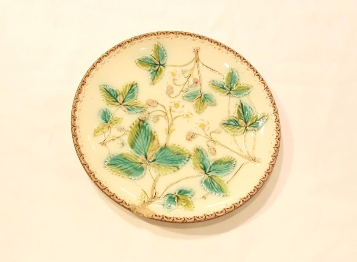Flatur kökudiskur með upphleyptum grænum laufblöðum og jarðarberjum. Amma gefanda pantaði diskinn úr dönskum vörulista. Amma gefanda var Jóhanna Sigurbjörg Þorsteinsdóttir (f.11.07.1873, d.03.03.1948) frá Höfn á Borgarfirði, síðar húsfreyja á Sandbrekku í Hjaltastaðaþinghá. Gæti verið frá aldamótunum 1900.