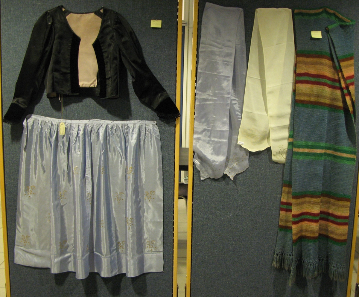 með áteiknuðu gylltu mynstri, b) peysufatasjal, vélprjónað - þverröndótt - skrautlegt. Gefandi er fædd í Þingmúla en ólst upp á Egilsstöðum. Af ömmu gefanda, Margéti Einarsdóttur (1891-1978) frá Þingmúla. Sigríður Einarsdóttir, systir Margrétar saumaði peysufötin.