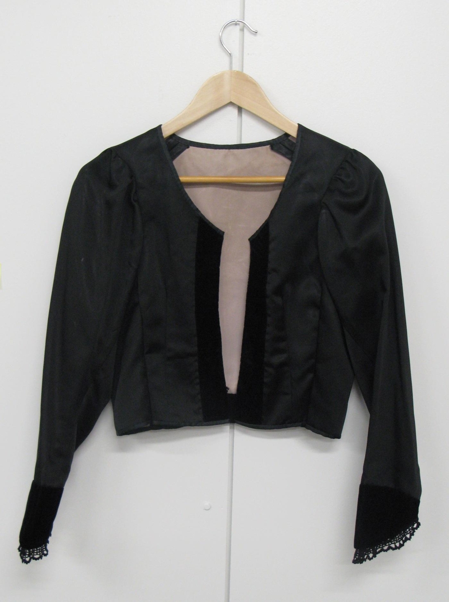Peysufatapeysa úr satíni - handheklaðar svartar blúndur á ermum. Hvítt peysufatabrjóst. Blátt silkisett með áteiknuðu gyltu mynstri. a) Hvítt slifsi