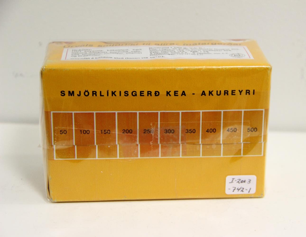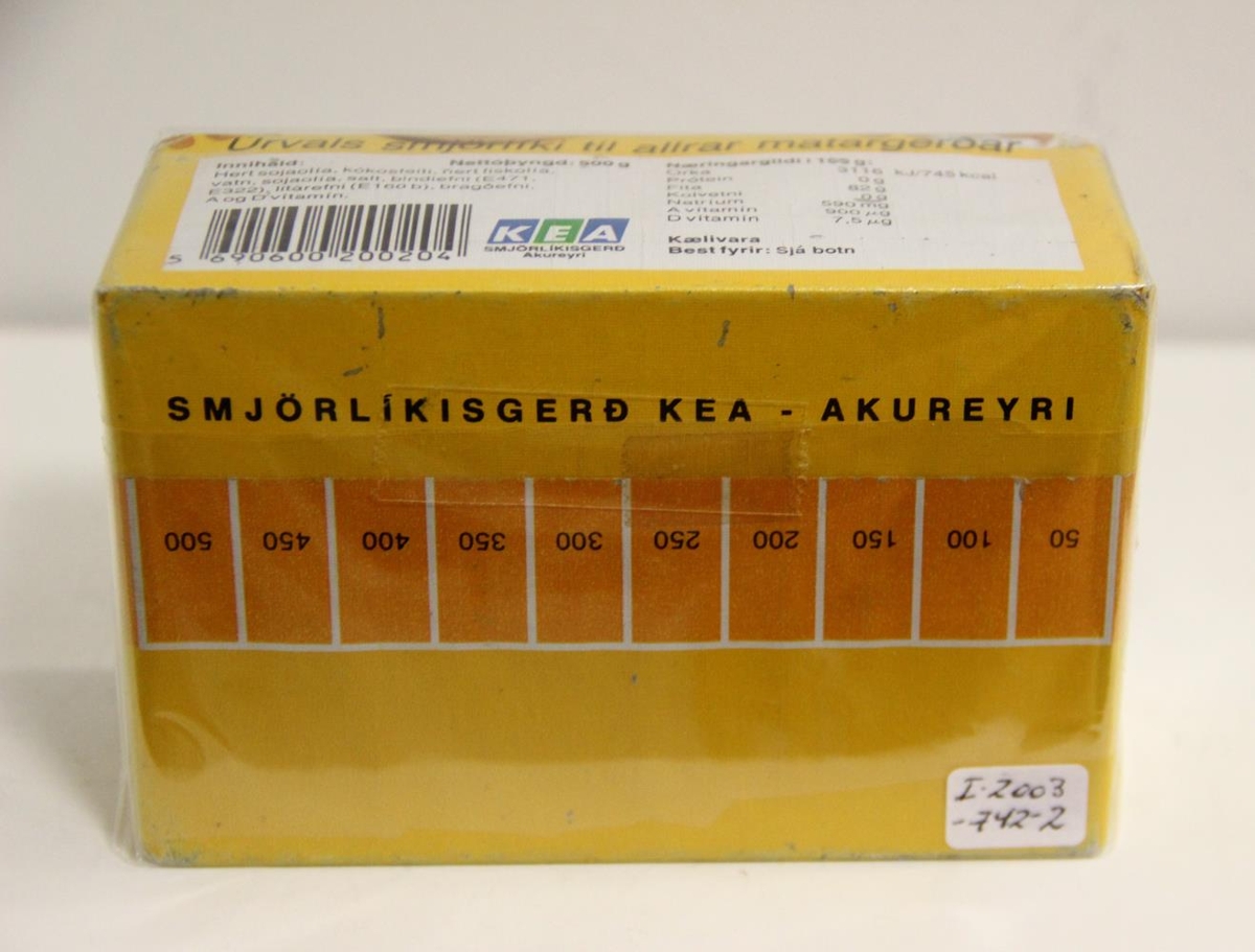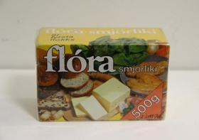 1.Gular umbúðir með gulu og rauðu prenti.Texti: Flóra smjörlíki 500 gr. Úrvals smjörlíki til allrar matargerðar.