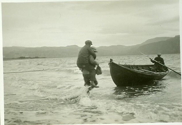 Karlmaður ber annan á baki sér úti í sjó í átt að árabát sem þriðji maðurinn situr í.