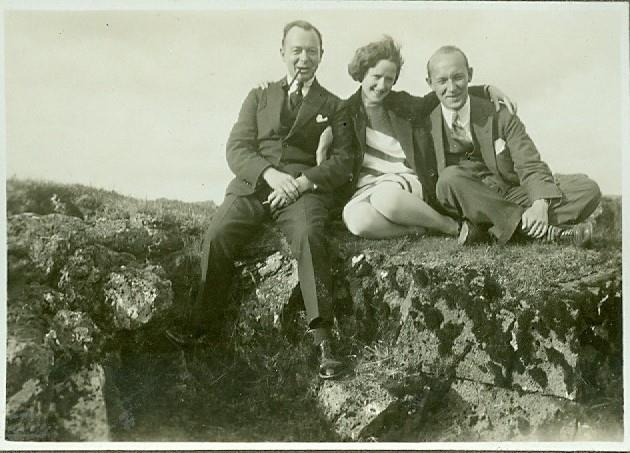 Tveir karlmenn og kona á milli þeirra sitja úti við.