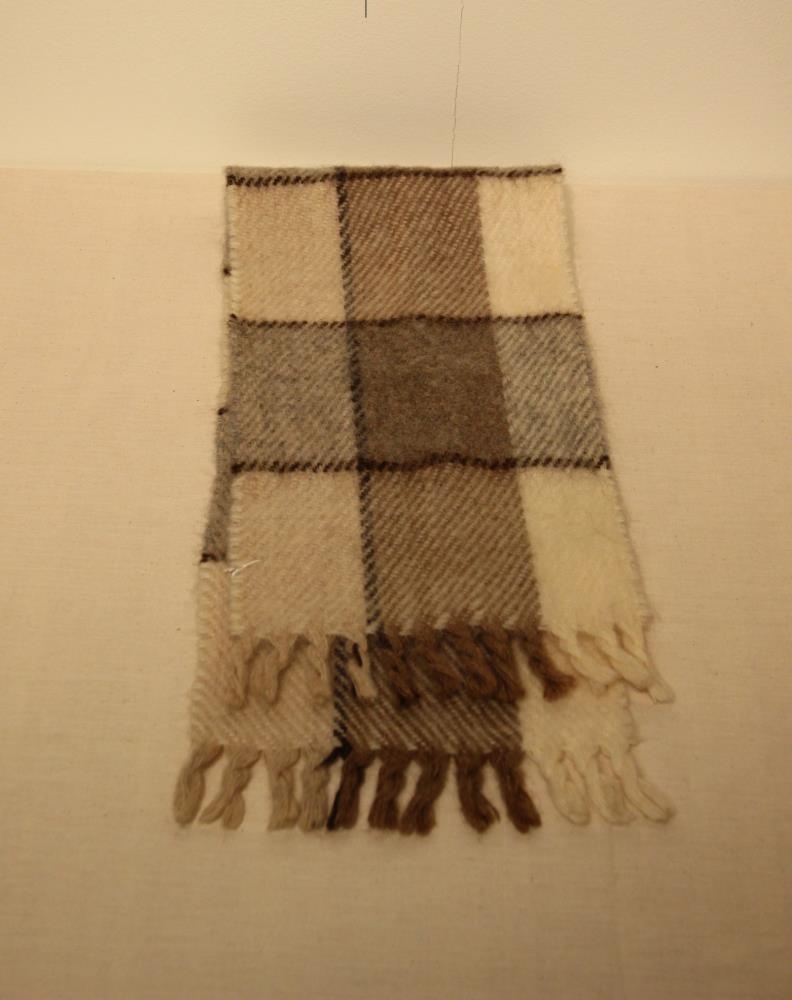 Trefillinn er köflóttur í hvítum, gráum og brúnum litum og kögraður í báða enda. Hann er gerður úr Gefjunarbandi, þ.e. íslenskri ull.