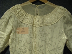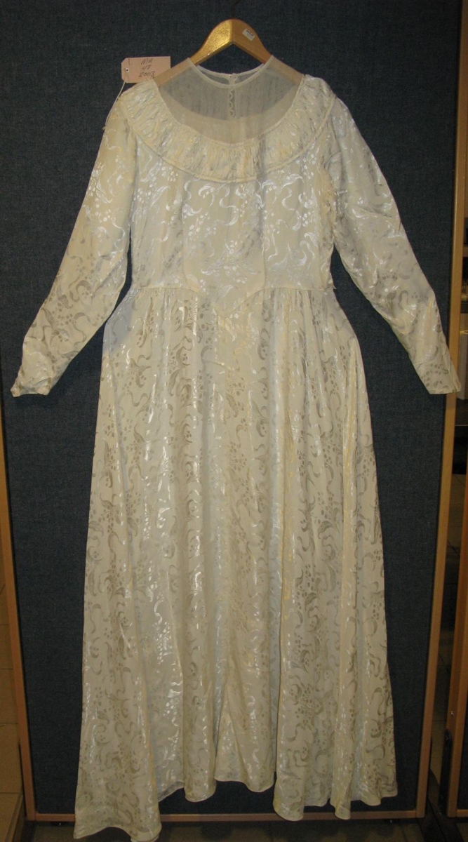 Hvítur, skósiður silkikjóll. Kjóllinn er úr mjög fallegu heilsilki uppí háls en þar er fallega rykkt brydding og síðan þunnt nælon efst í hálsmáli. Kjóllinn er langerma og eru smellur fremst á ermum. Hann er hnepptur að aftan, en það eru ekki hnappar á honum. Saumsprettur eru sitthvoru megin á hliðum á blússu og rétt fyrir ofan pilsið. Smellur eru á ermunum fremst. Kjóllinn er saumaður af Kristínu Sigfúsdóttur.