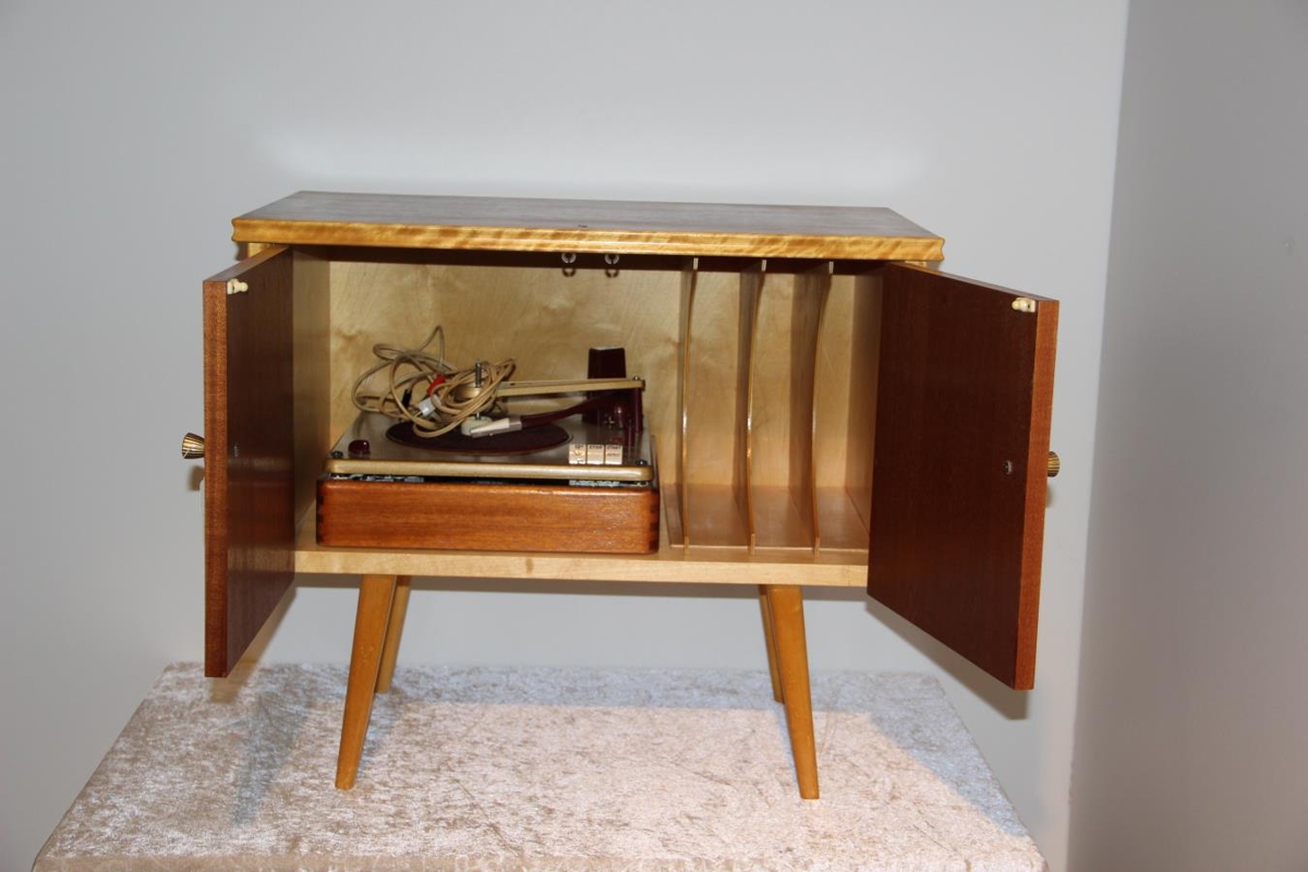 Skápurinn er brúnn með ljósum köntum, tveimur hurðum og gylltum handföngum.