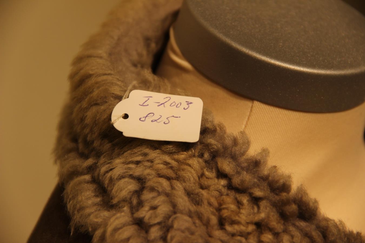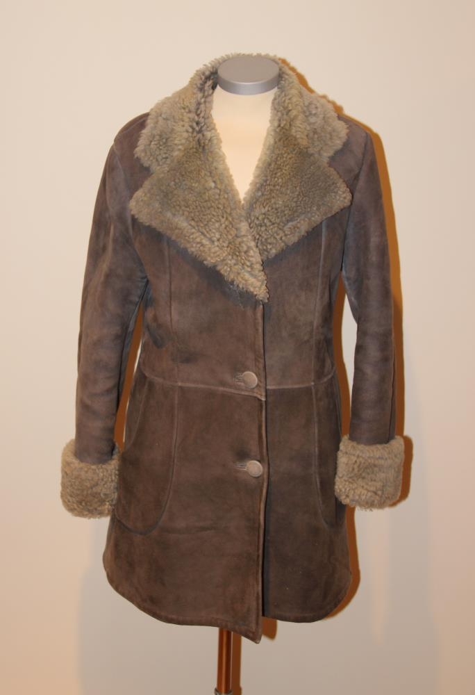 Jakkinn er gráblár að utan en gæran sem snýr inn og er í kraga, er grá. Stærð 40.