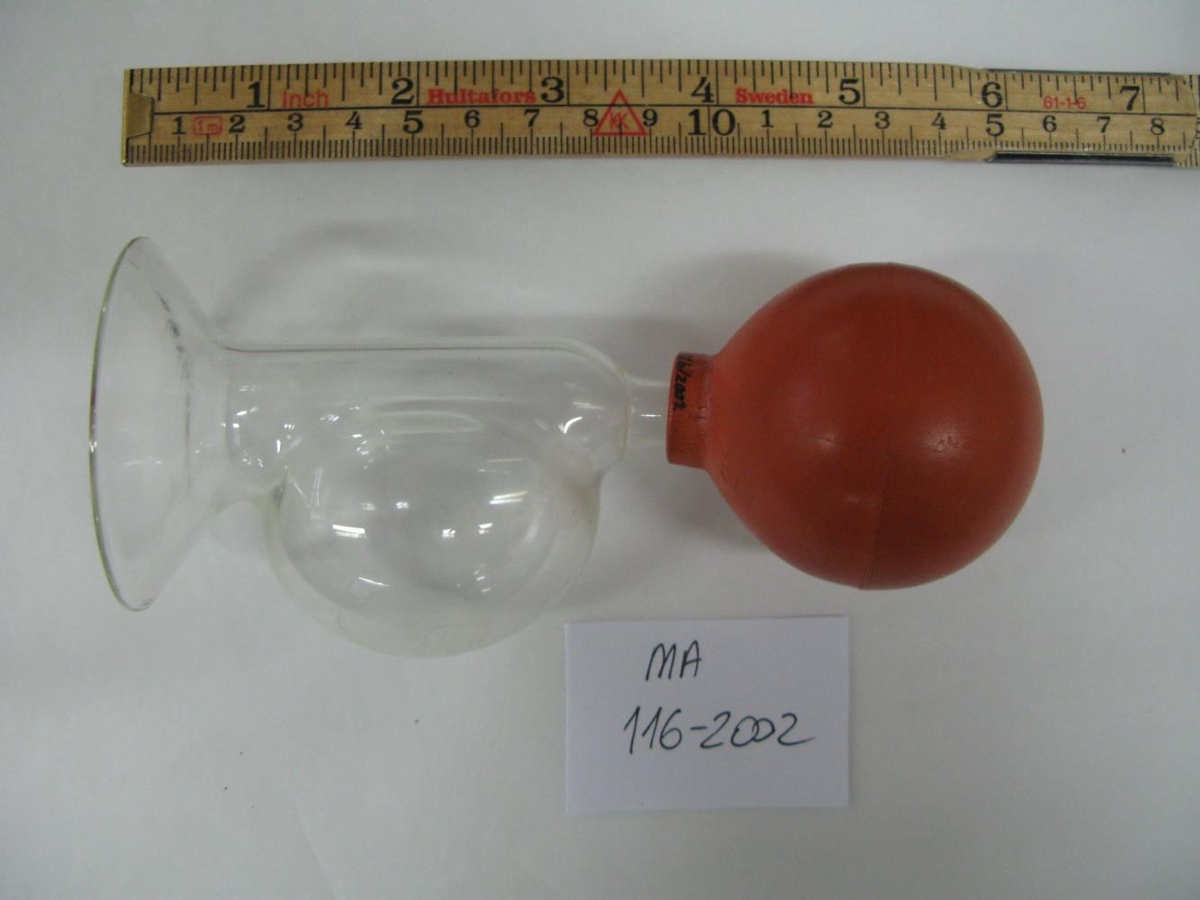 Glerílát með rauðri gúmmípumpu. Margrét Aðalsteinsdóttir fékk glasið að gjöf frá Nönnu Hansdóttur, árið 1987 en hluturinn hefur líklega verið keyptur í kring um 1970. Á dælunni stendur 2" (5 cm eru 2", gæti verið þvermálið). Annað heiti: Brjóstadæla, brjóstapumpa, brjóstasuga.