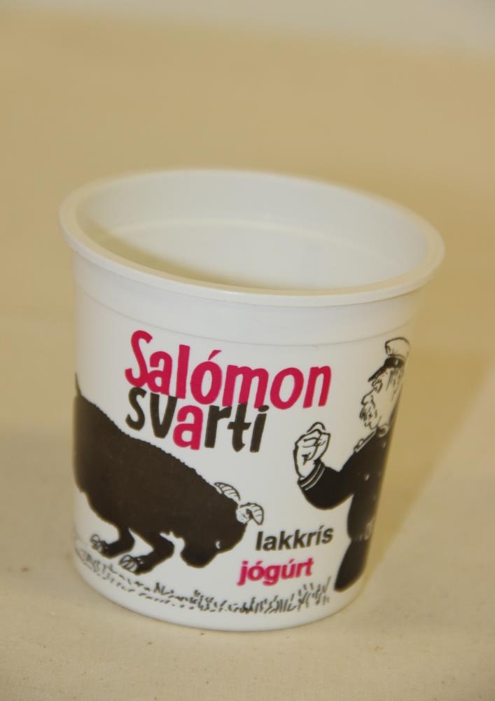 Hvítt plastbox. Áprentun í svörtum og rauðum lit. Áprentun: Salómón svarti - lakkrís jógúrt. Mynd af svörtum (mannýgum) hrút og lögregluþjóni (steytandi hnefann). Innihaldslýsing og næringargildi. Framl. box: Sigurplast hf. Boxið er 7,5 cm. í þvermál.