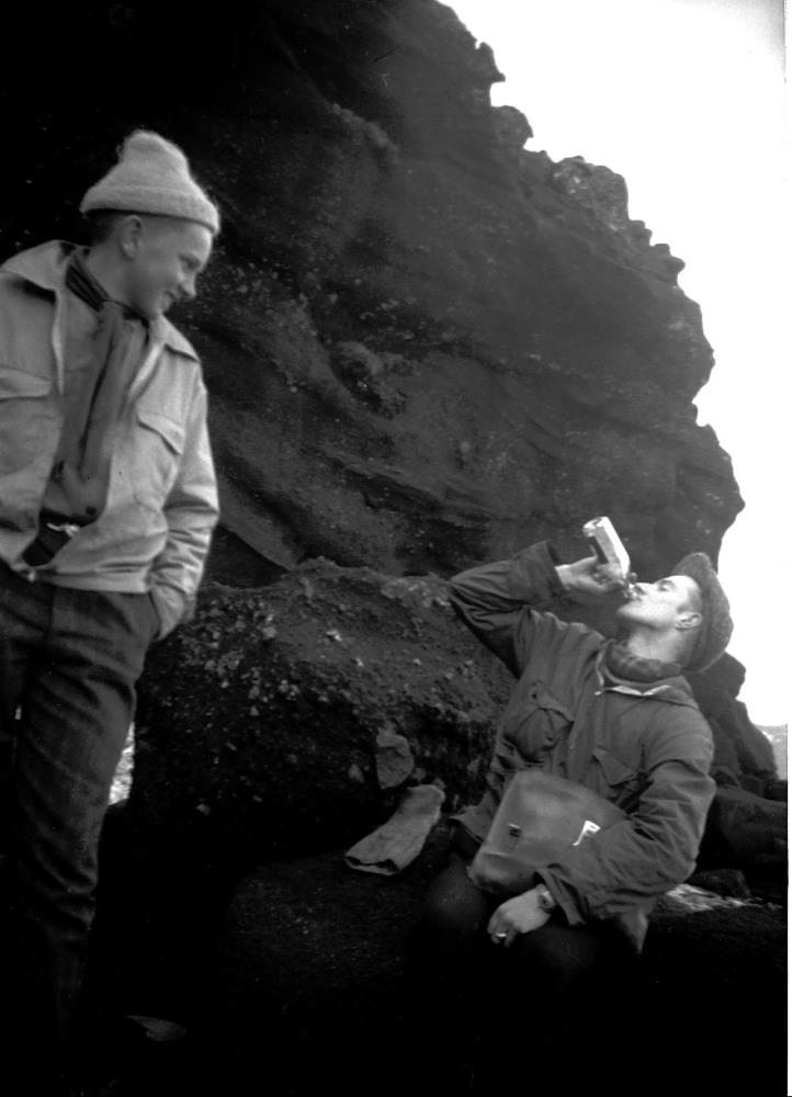 Tveir karlmenn, annar teigar af stút. Háir klettar um kring.