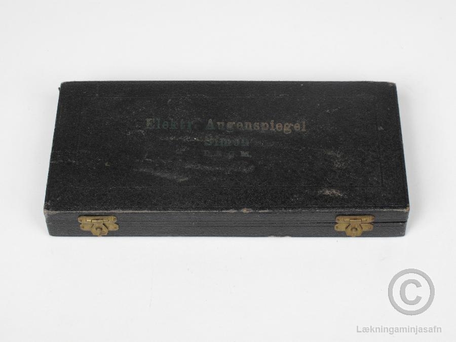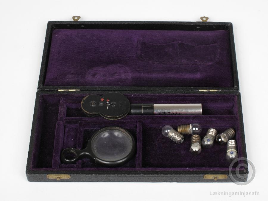 Augnspegill. Er í svörtum bláfóðruðum kassa, í kassanum er stækkunargler og 6 perur.