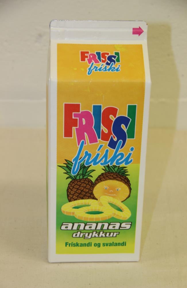 Pappaferna klædd álpappír að innan, undir 2 lítra af ávaxtadrykk. Áprentun í mörgum litum. Grunnlitir; gulur og grænn. Þrjár hliðar: Frissi fríski ananasdrykkur. Teikning af ananasávexti og sneiðum. Framleiðandi fernu: Elopak, Norge.