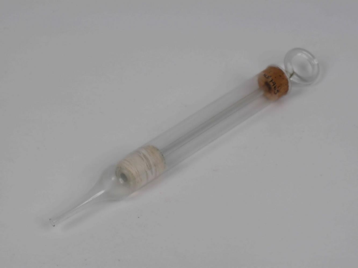 Dælan er eingöngu úr gleri, með korktappa í enda.