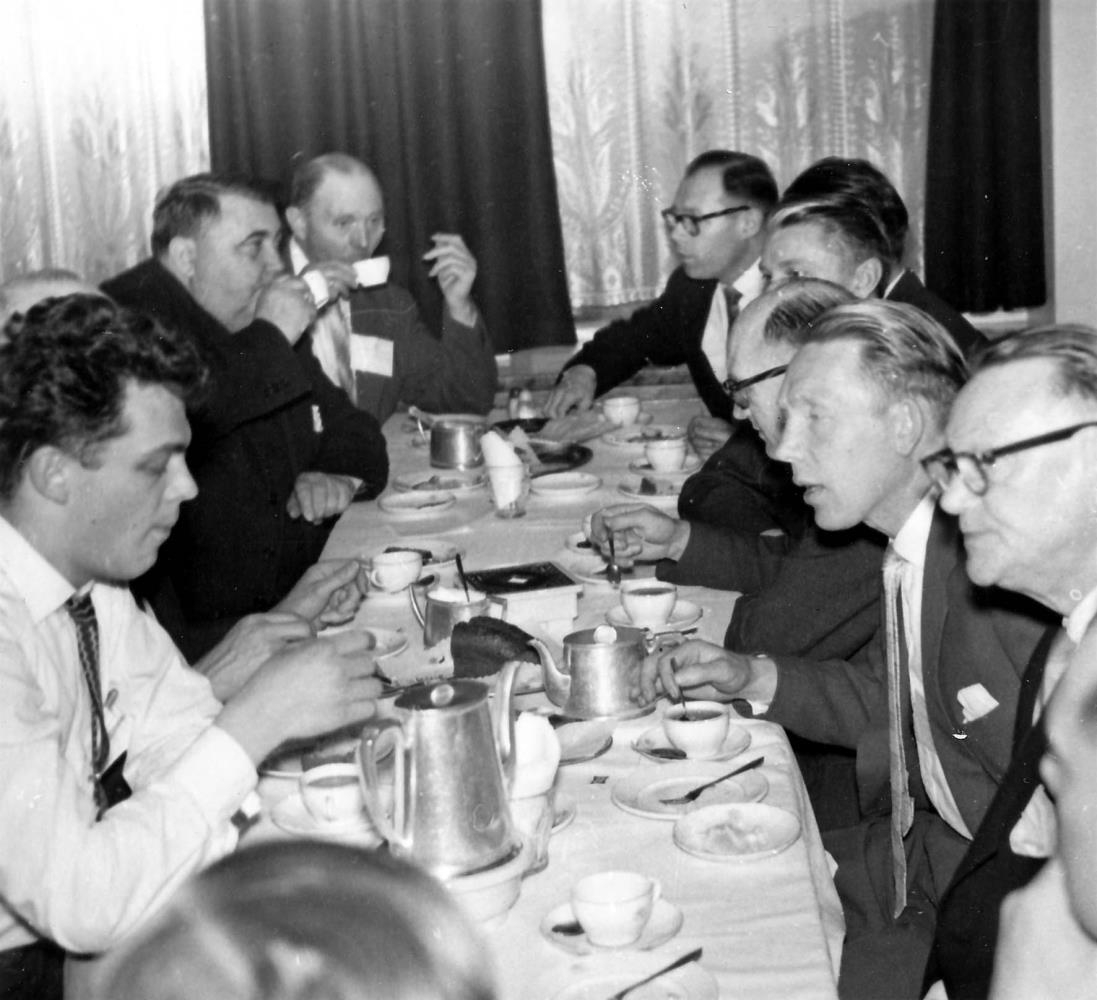 Lengst til hægri réttir Þorsteinn Thorlacius, fyrrum bóksali á Ráðhústorgi, höndina í átt að veitingunum.