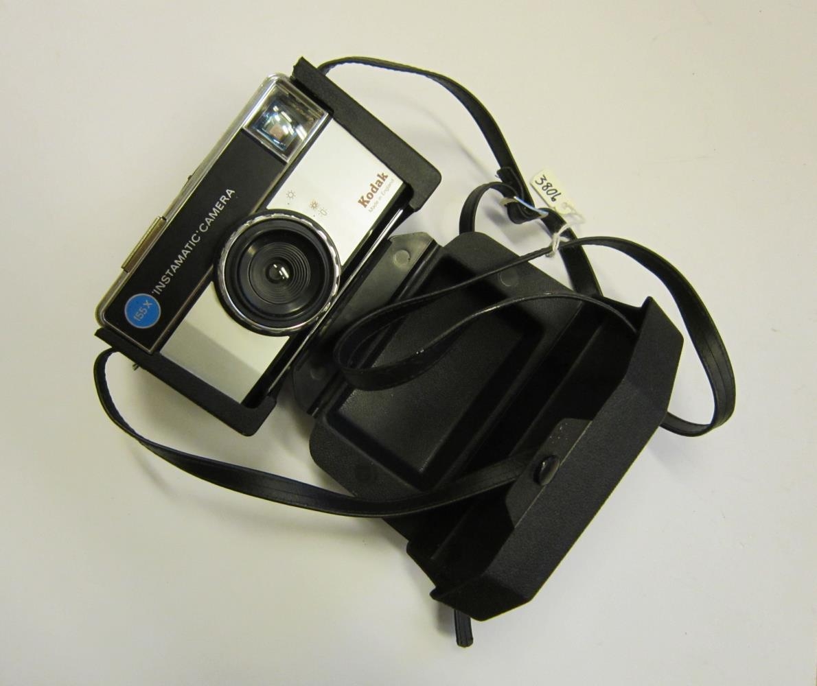 Myndavél, gerð Kodak ´instamatic´camera, gerð fyrir flashkubb. Myndavélin er í svörtu plasthulstri, sem er opnað til að taka mynd, án þess þó að taka vélina úr því.
