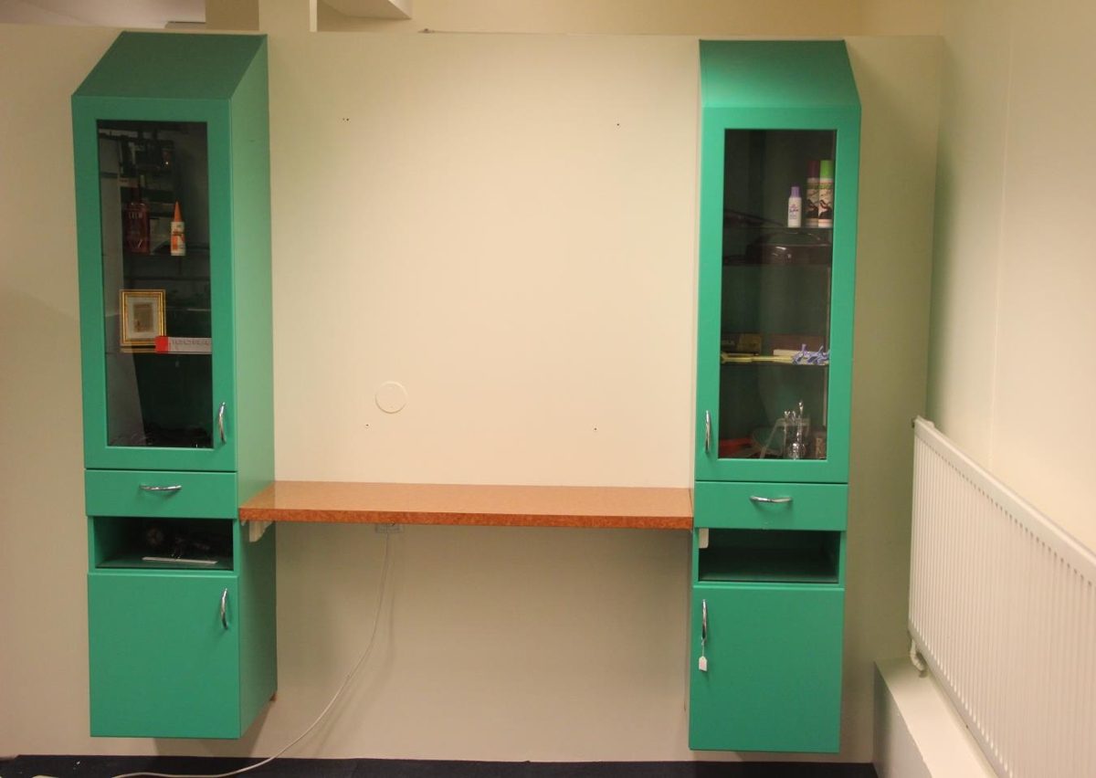 Tveir grænir skápar með glerhurðum. Borð og spegill á milli. Áhöld og snyrtivörur rakara/hársnyrtis eru í og á innréttingunni s.s rafmagnshárklippur, rakhnífur, greiður o.fl. Efst á spegli er blátt skilti með hvítum stöfum með áletruninni: Hársnyrting Reynis. Það hét stofan eftir að Reynir tók við af föður sínum, Jóni Eðvaldssyni, sbr færslu 2004 - 1473.