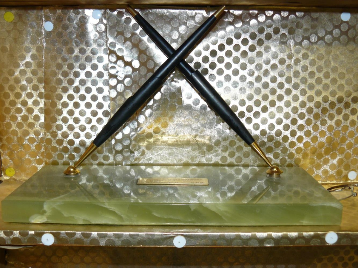 Pennastandur, gjöf frá Kiwanisklúbbnum Hof í Garði til Unu Guðmundsdóttur (1894 - 1978) frá Sjólyst í Garði í tilefni 75 ára afmælis hennar 18. nóvember 1969. Tveir pennar fylgja standinum.