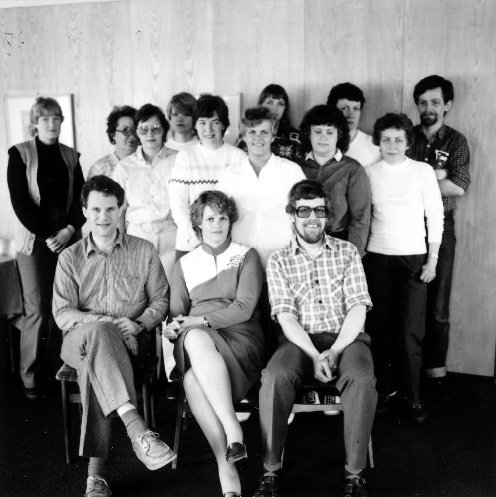 Starfsmannanámskeið SKE, Starfsmannafélagi Kaupfélags Eyfirðinga. Fremst sitja: Þórir Páll Guðjónsson, kennari Bifröst, óþekkt kona, Stefán Vilhjálmsson.