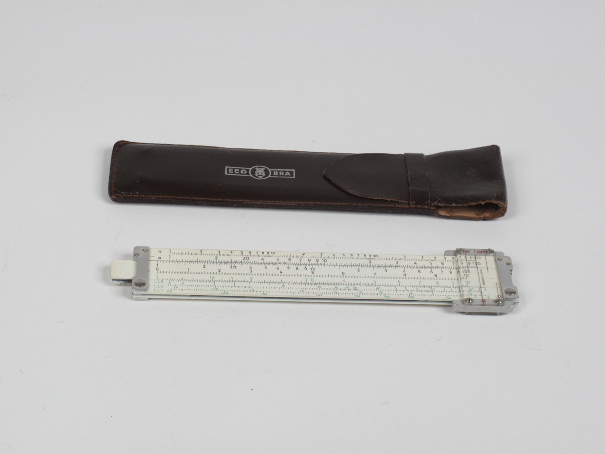 Reiknisstokkur. Hvítur reiknisstokkur í brúnu leðurhulstri.