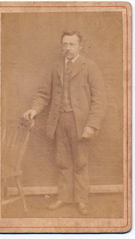 Karlmaður. Ljósmynd úr búi Kristjáns Jóhannessonar (1866-1910) kaupfélagsstjóra á Eyrarbakka. Eftir lát hans voru synir hans Sigurður kaupmaður á Eyrarbakka og Jóhannes búsettur í Reykjavík, með ljósmyndina sem varveitt var í myndaalbúmi. Kristján sonur Sigurðar gaf fjórar ljósmyndamöppur á Byggðasafn Árnesinga í október 2015 og er ljósmyndin úr því safni.