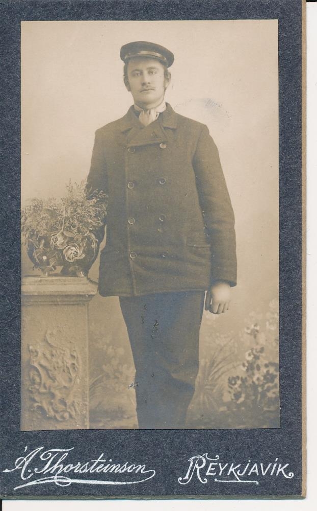 Karlmaður. Ljósmynd úr búi Kristjáns Jóhannessonar (1866-1910) kaupfélagsstjóra á Eyrarbakka. Eftir lát hans voru synir hans Sigurður kaupmaður á Eyrarbakka og Jóhannes búsettur í Reykjavík, með ljósmyndina sem varðveitt var í myndaalbúmi. Kristján sonur Sigurðar gaf fjórar ljósmyndamöppur á Byggðasafn Árnesinga í október 2015 og er ljósmyndin úr því safni.