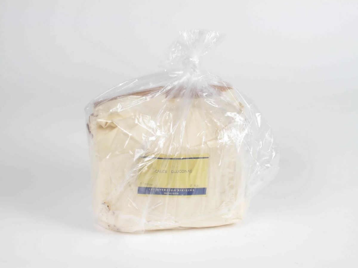 Er pakkað í pappír. Merking: Calcii Gluconas.