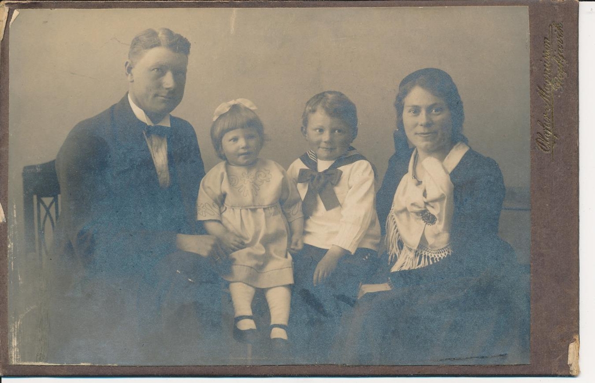 Hjónin á Strönd Eyrarbakka þau Steingrímur Gunnarsson og Þuríður Guðjónsdóttir frá Hólmsbæ ásamt tveimur börnum sínum. Ljósmynd úr búi Kristjáns Jóhannessonar (1866-1910) kaupfélagsstjóra á Eyrarbakka. Eftir lát hans voru synir hans Sigurður kaupmaður á Eyrarbakka og Jóhannes búsettur í Reykjavík, með ljósmyndina sem varðveitt var í myndaalbúmi. Kristján sonur Sigurðar gaf fjórar ljósmyndamöppur á Byggðasafn Árnesinga í október 2015 og er ljósmyndin úr því safni.