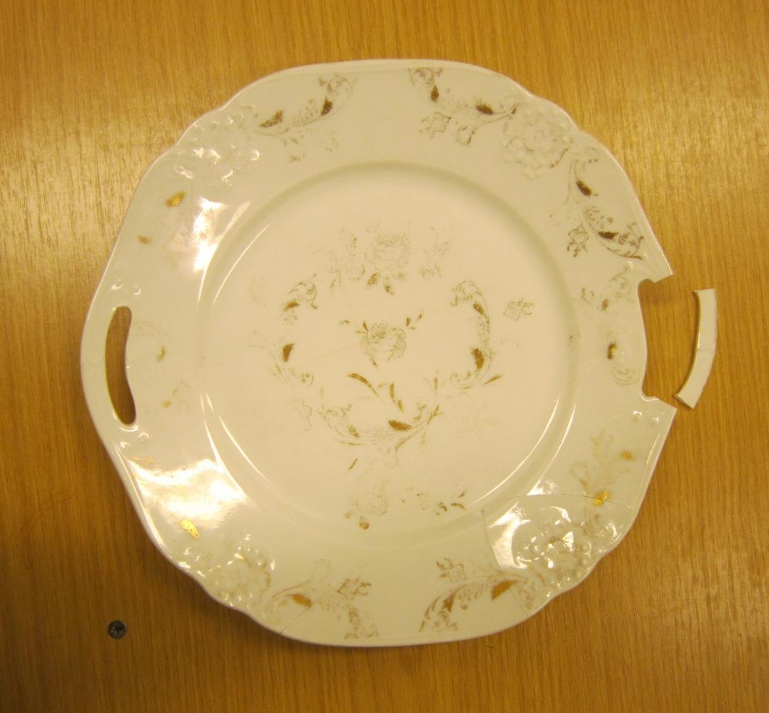 Kökudiskur, hvítur að lit með gylltum rósum og upphleyptu munstri á börmum. Diskurinn er frá Hvítárósi.
