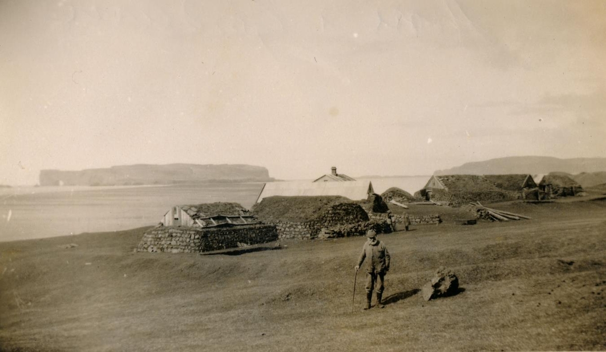 Garðar í Mýrdal um 1930. Árni Högnason bóndi þar styður sig við staf að húsabaki.